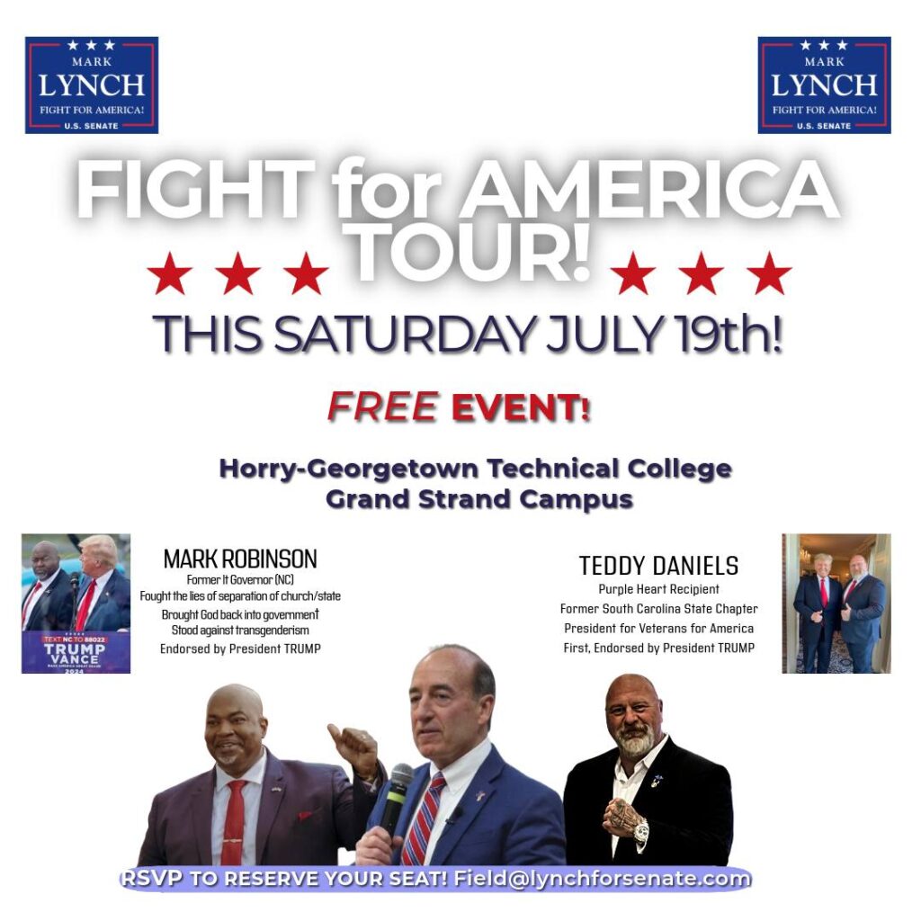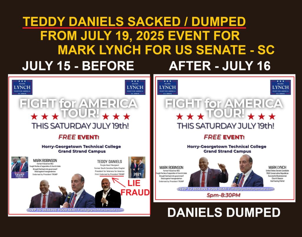 As you can see, once Mark Lynch for US Senate realized he was duped by both Teddy Daniels AND Noel Fritsch, new flyers were put out, Teddy Daniels was dumped from the July 19, 2025 event in Myrtle Beach, and shortly afterwards removed from Lynch’s campaign.