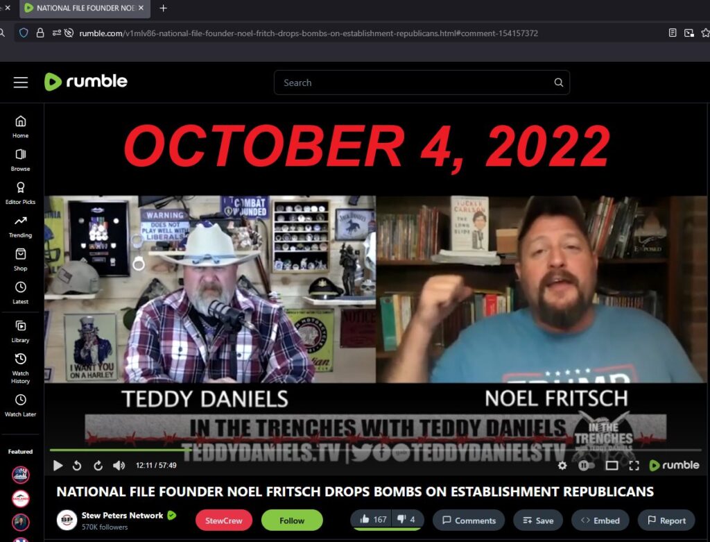 As you may know by now, “In the Trenches with Teddy Daniels” never came close. Attached to the Stew Peters Network in June 2022, Teddy Daniels worked together with this same Noel Fritsch, to pump each other up, and try to cash in on internet fame. Never happened. Within 15 months, the Stew Peters Network dumped Teddy Daniels, and “In the Trenches” was no more. Below is a screenshot of 1 of several “episodes” with guest NOEL FRITSCH joining host TEDDY DANIELS “In the Trenches”. Some of these survive, on YouTube or Rumble. (Challenge – See if you can find Teddy Daniels “In the Trenches” admitting he pays NO taxes, and NEVER files Form 1040 with the IRS.) But there they are, yucking it up, while spreading conspiracy theories, making odd claims, and of course, Teddy Daniels repeatedly LYING about his police employment history, his military service, his supposed connections to Donald Trump and the White House (in 2022 and 2023?) and more.