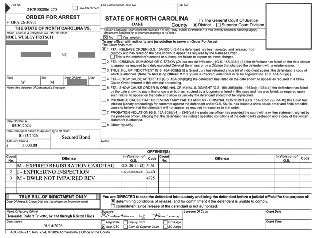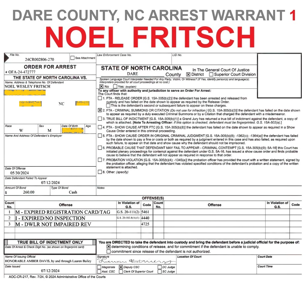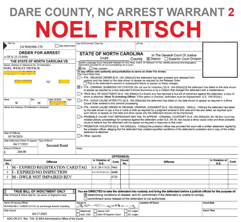 NOEL FRITSCH was released after this new mugshot, with a new court date set for January 13, 2026, at the Dare County Courthouse. However, once again, Noel Fritsch FAILED TO APPEAR, and so a new 3rd WARRANT / ORDER FOR ARREST was issued on January 14, 2026.